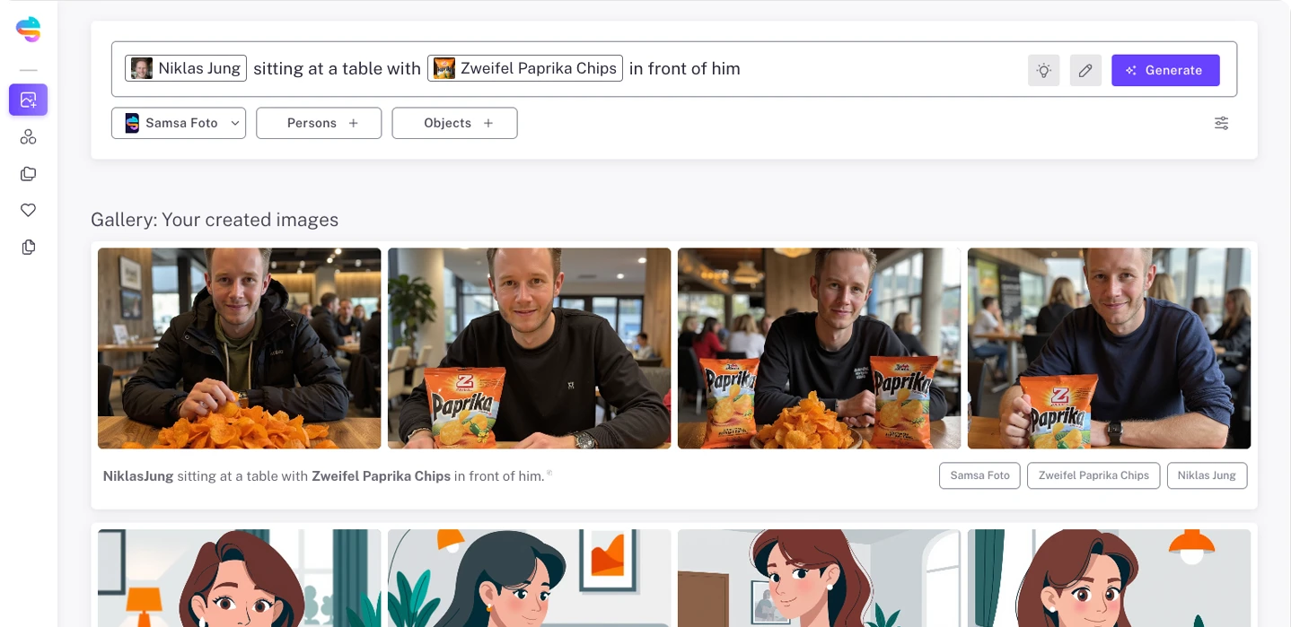 Upload a few reference images and Samsa learns your visual identity – ready for anyone on your team to generate perfectly consistent content.